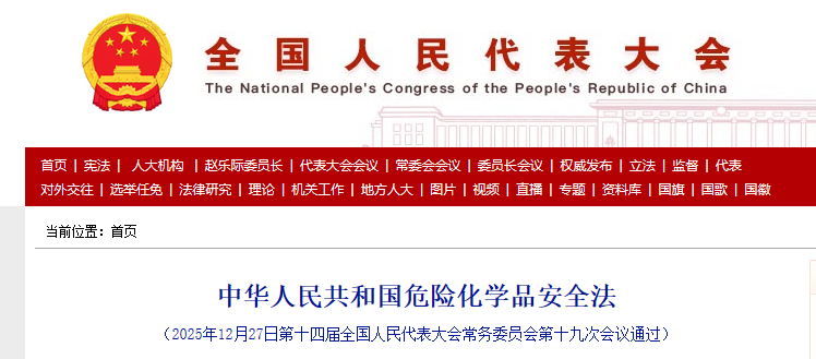 《中华人民共和国危险化学品安全法》于2025年12月27日第十四届全国人民代表大会常务委员会第十九次会议通过,自2026年5月1日起施行。 危险化学品管理从原来的《危险化学品条例》(行政法规)监管,增加了一个上位法《中华人民共和国危险化学品安全法》(法律),意味着其法律效力上升一个台阶。